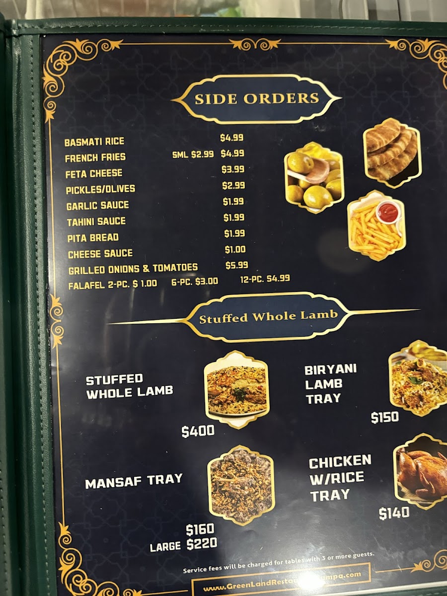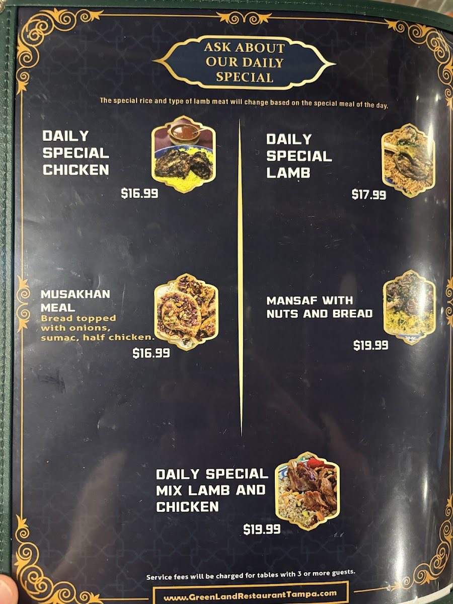 Lamb, chicken, rice, and soup of the day special. You may substitute yogurt or salad for the soup as your side